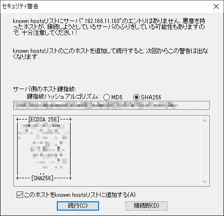 LAN環境にあるSSHサーバに接続する例を以下に示します。