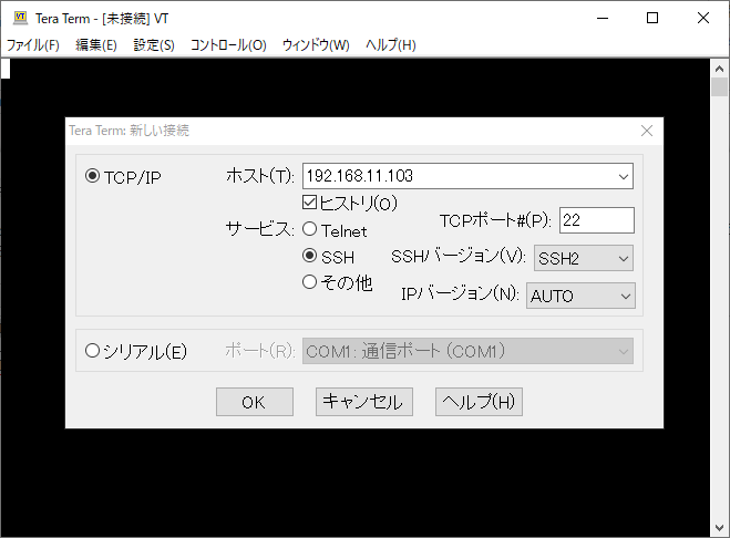 インストール時に、デスクトップにTera Term のショートカットを作成したので、それをダブルクリックして開きます。