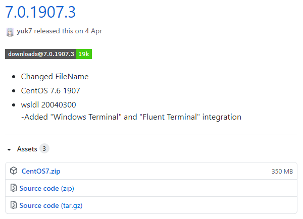 本章では、WSL2にCentOS7を設置するので、7.0.1907.3 をダウンロードします。